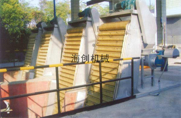 該設(shè)備采用回轉(zhuǎn)式,由一種特殊形狀的犁形耙齒按一定的裝配順序和數(shù)量排列在橫軸上,組成耙齒鏈,根據(jù)過(guò)水流量,裝配成不同的間隙,安裝在泵站或水處理系統(tǒng)的入口處,當(dāng)驅(qū)動(dòng)裝置帶動(dòng)耙齒鏈自下向上運(yùn)動(dòng)時(shí),水中的雜物被耙齒鏈撈起,液體則在柵隙中流過(guò),設(shè)備轉(zhuǎn)動(dòng)到上部頂點(diǎn)后,耙齒鏈改變運(yùn)行方向,由上向下運(yùn)動(dòng),物料依靠自重從耙齒上自行脫落,當(dāng)耙齒從反面轉(zhuǎn)到設(shè)備底部時(shí),又開始另一循環(huán)往復(fù)的連續(xù)運(yùn)行,從而不斷的從水中清撈雜物,達(dá)到固液分離的目的。